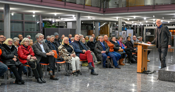 Festvortrag im Rathausfoyer von Architekt, Kunsthistoriker und Journalist Dr. Dietrich Heißenbüttel zu „90 Jahre Rathausneubau. Warum sich die sachlich-zurückhaltende Rathausarchitektur von Paul Bonatz nicht für politisch-ideologische Projektionen des